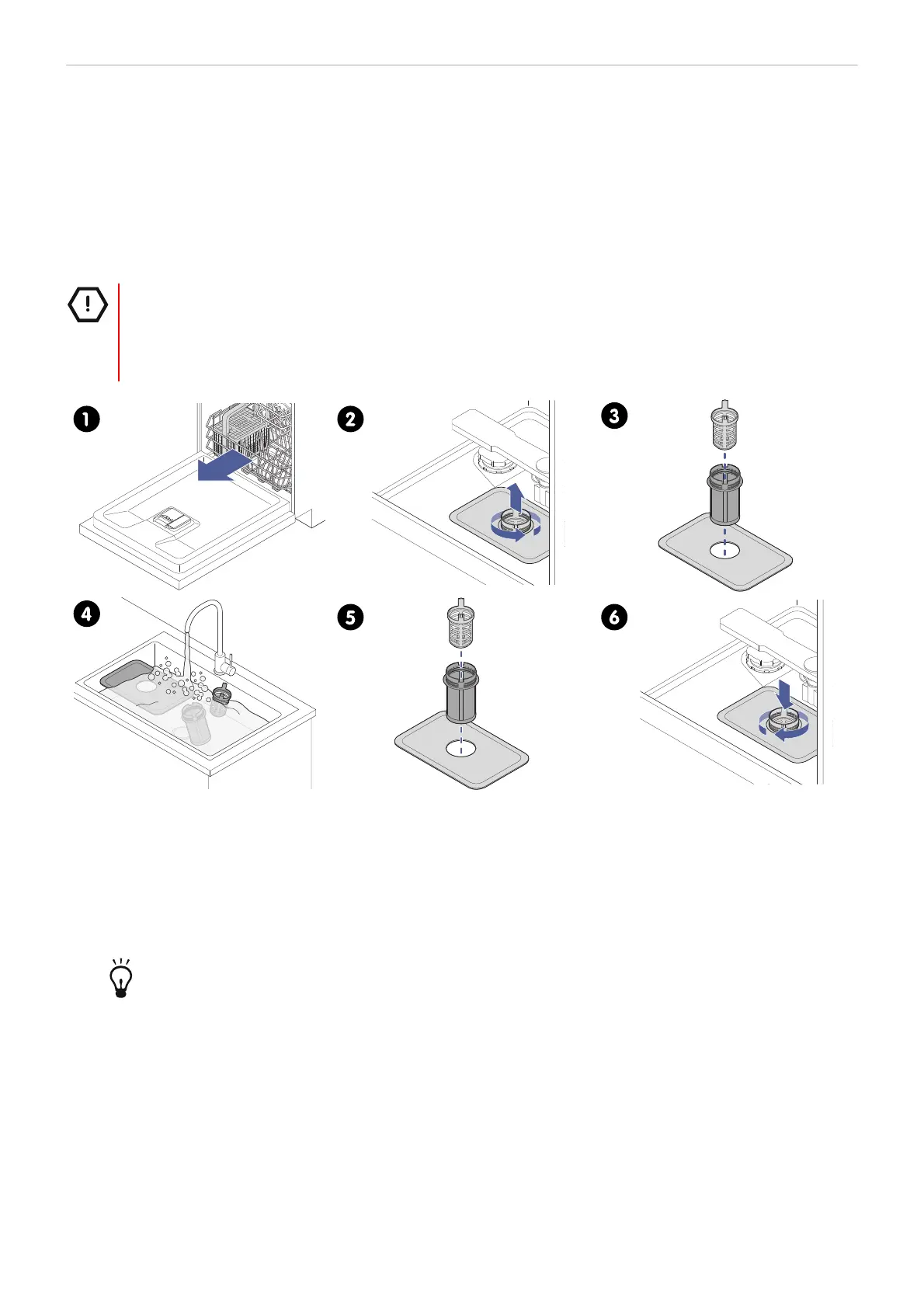 NOTE! If you are just cleaning the coarse filter, remove large food remnants and put the filters back in their