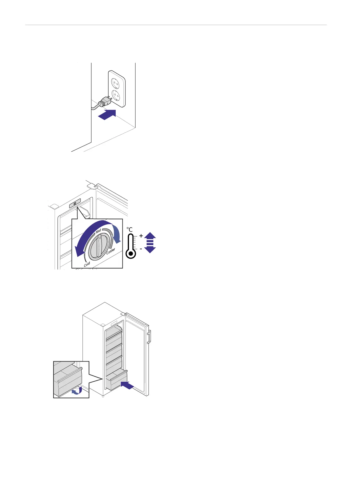 BEMÆRK! Af sikkerhedsårsager har fryserens skuffer stopklodser. Sæt en skuffe i igen ved at sænke skuffens
