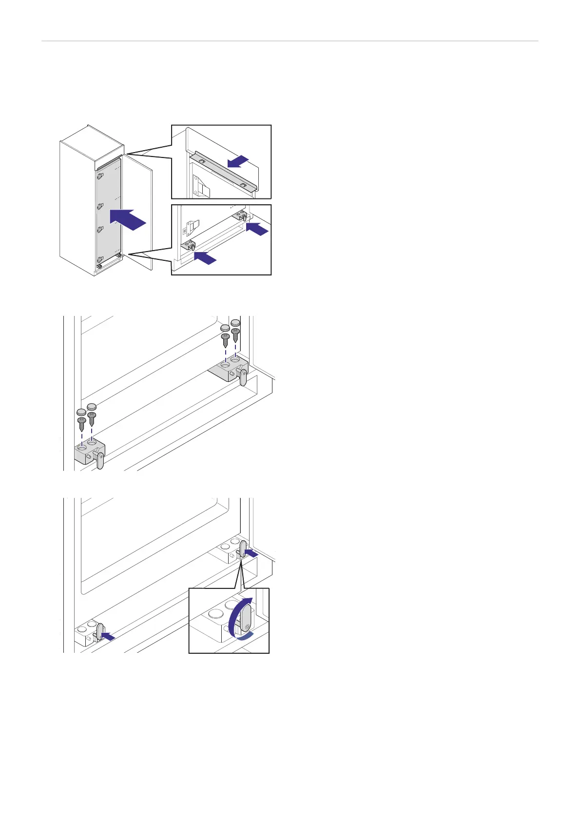 3. Skjut in kylskåpet i skåpstommen. Se till att den övre kanten på plåten och begränsningshaken för stödbenet vilar