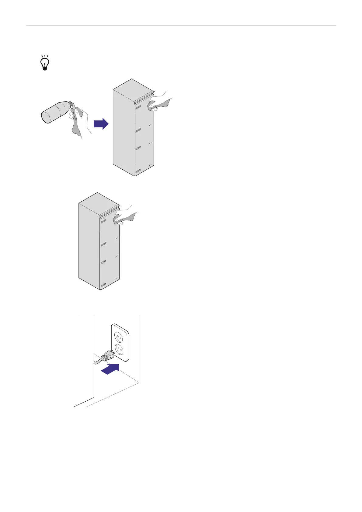 OBS! Ikke koble kjøleskapet til strømforsyningen før det er helt tørt.