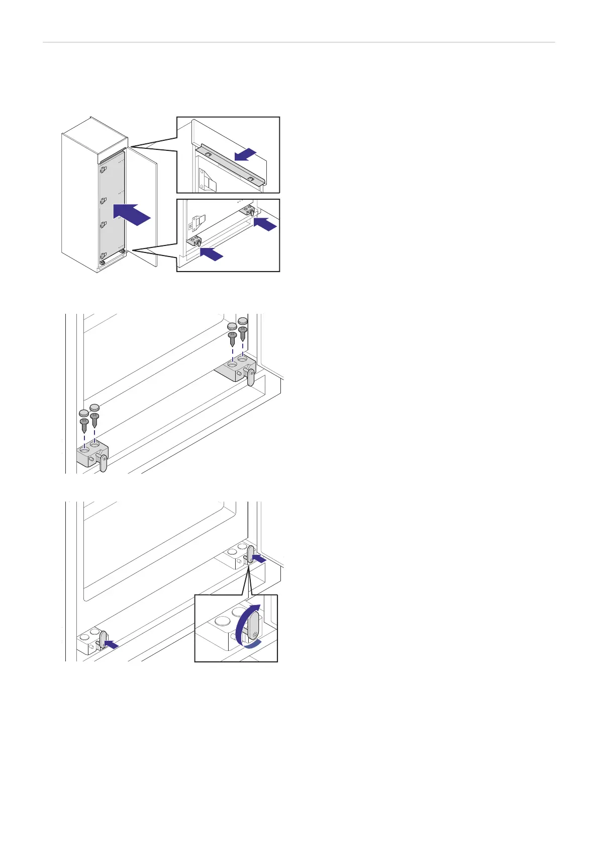 3. Skyv kjøleskapet inn i kabinettet. Pass på at øvre kant på skilleplaten og begrensningskroken på støttebeinet hviler