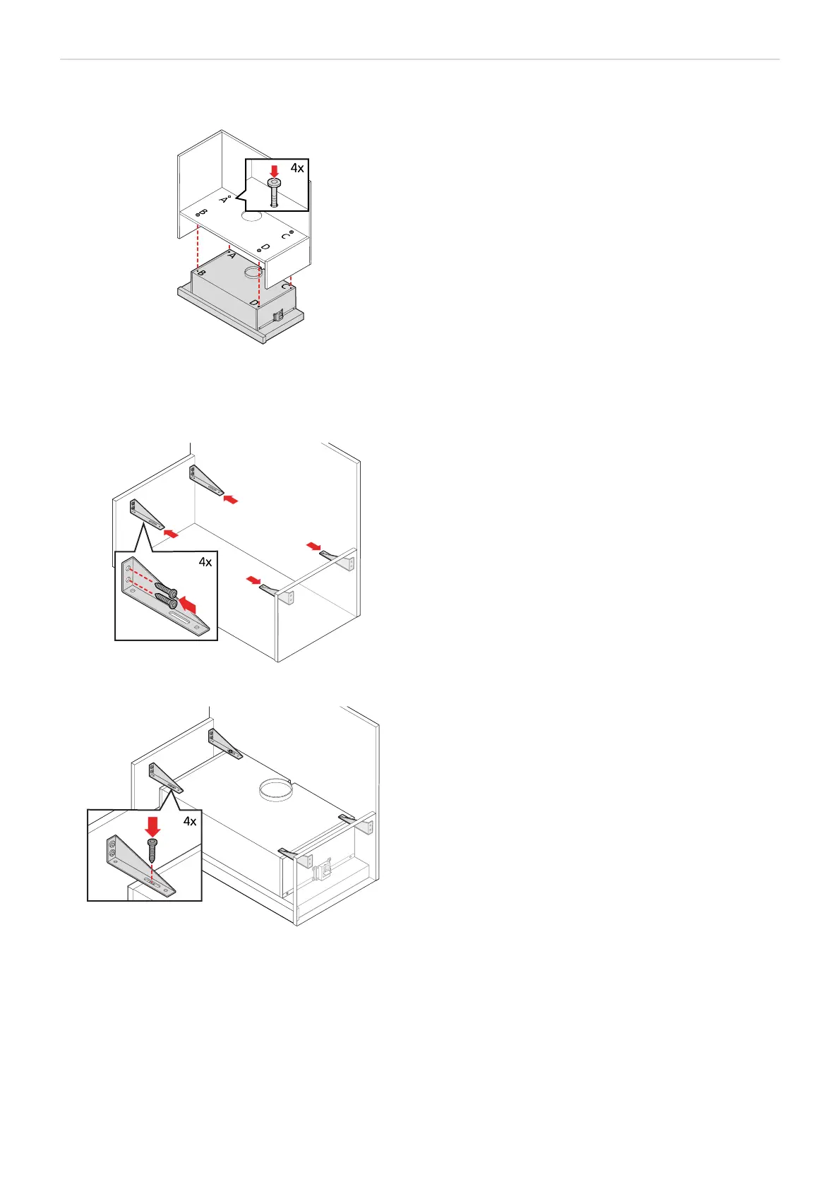 4. Fäst köksfläkten med de medföljande skruvarna på punkterna märkta med A, B, C, D.
