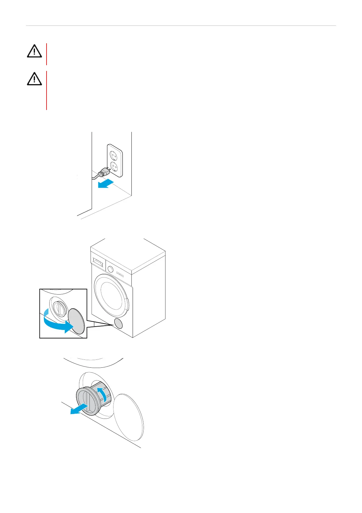 • During operation, there may be hot water in the drain pump. Never remove the pump cover during a