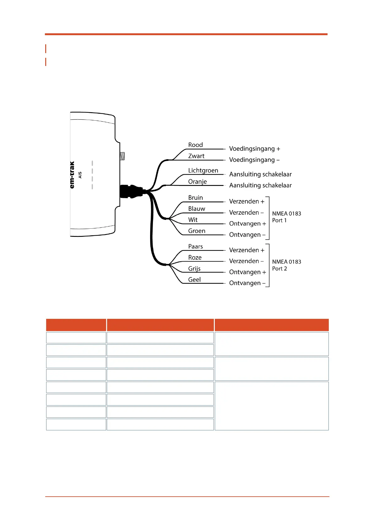 In de onderste tabel in vindt u de functie van elke gekleurde draad.