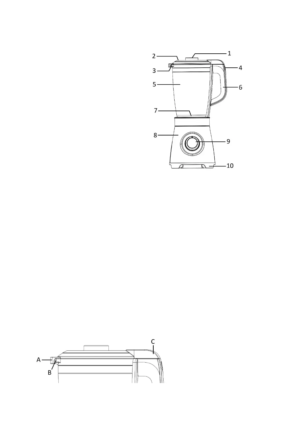 3. Ponga la tapa en la jarra. Cubra primero un extremo de la tapa (A) sobre la boquilla (B) de la jarra y, a
