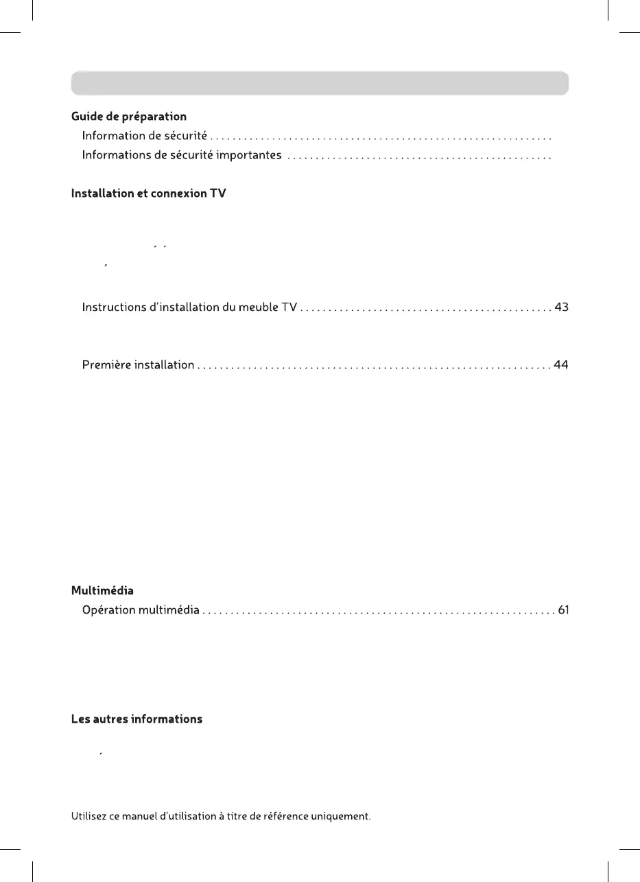 • Installer et connecter le televiseur. . . . . . . . . . . . . . . . . . . . . . . . . . . . . . . . . . . . . . . . . . . . . . . . .. . . 43
