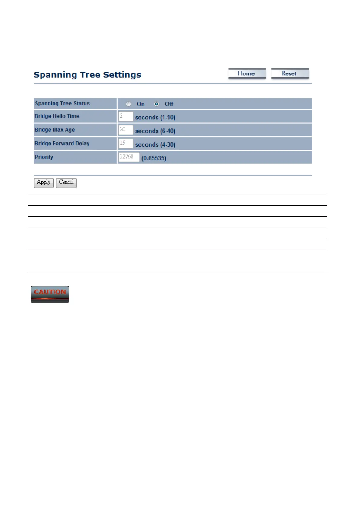 Spanning Tree Status Select the Radio button to On or Off Spanning Tree function.