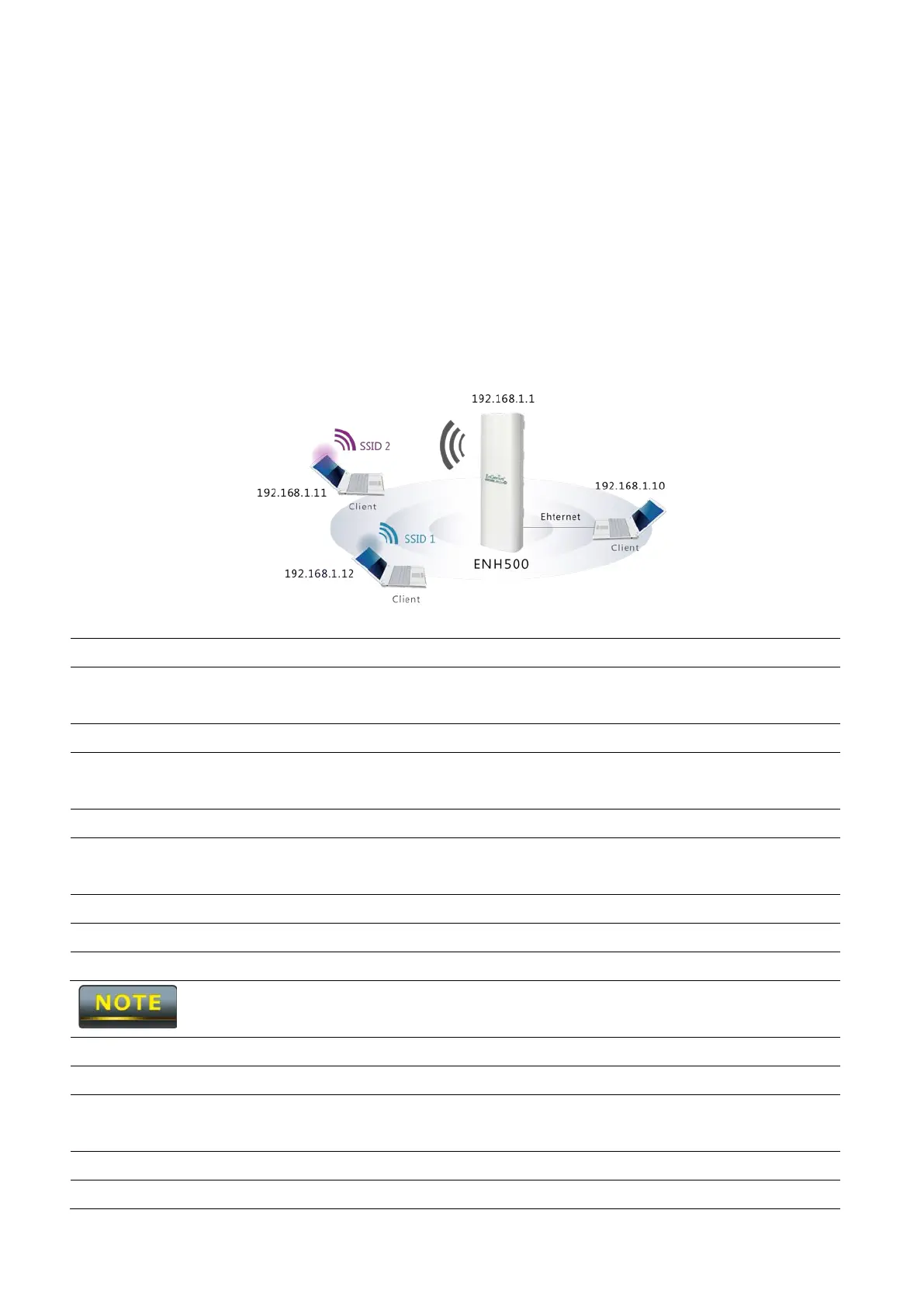 This chapter describes the role of the ENH500 with 4+1 modes. The Access Point mode’s