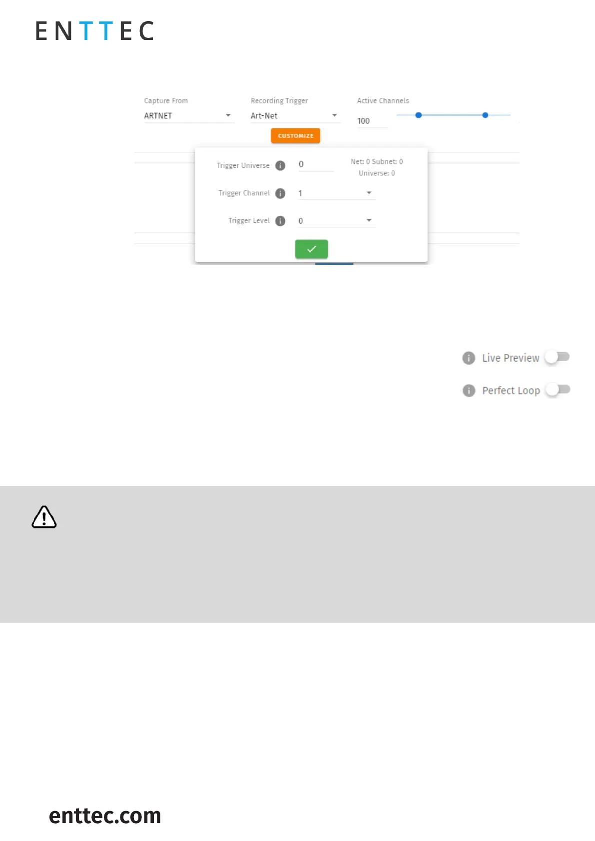 Recording Tips: During Art-Net or sACN recording, when utilizing the 'live preview' function, it is crucial