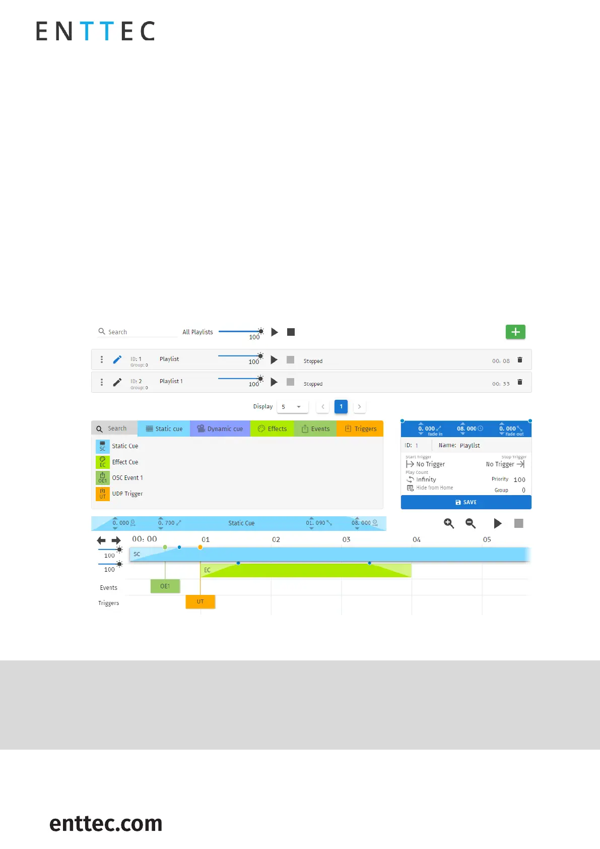 The playlist editor allows the user to add multiple cues (static, dynamic or effect), events and triggers