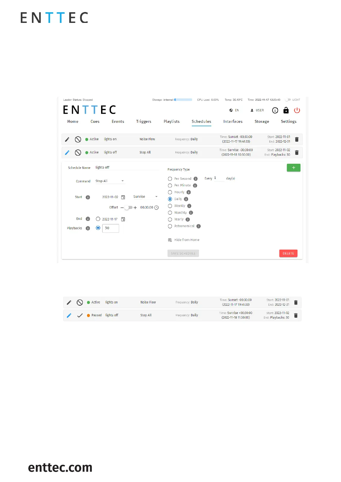 The second schedule in the S-PLAY LITE will ‘Stop All’ playlists 30 minutes after sunrise each day for 30