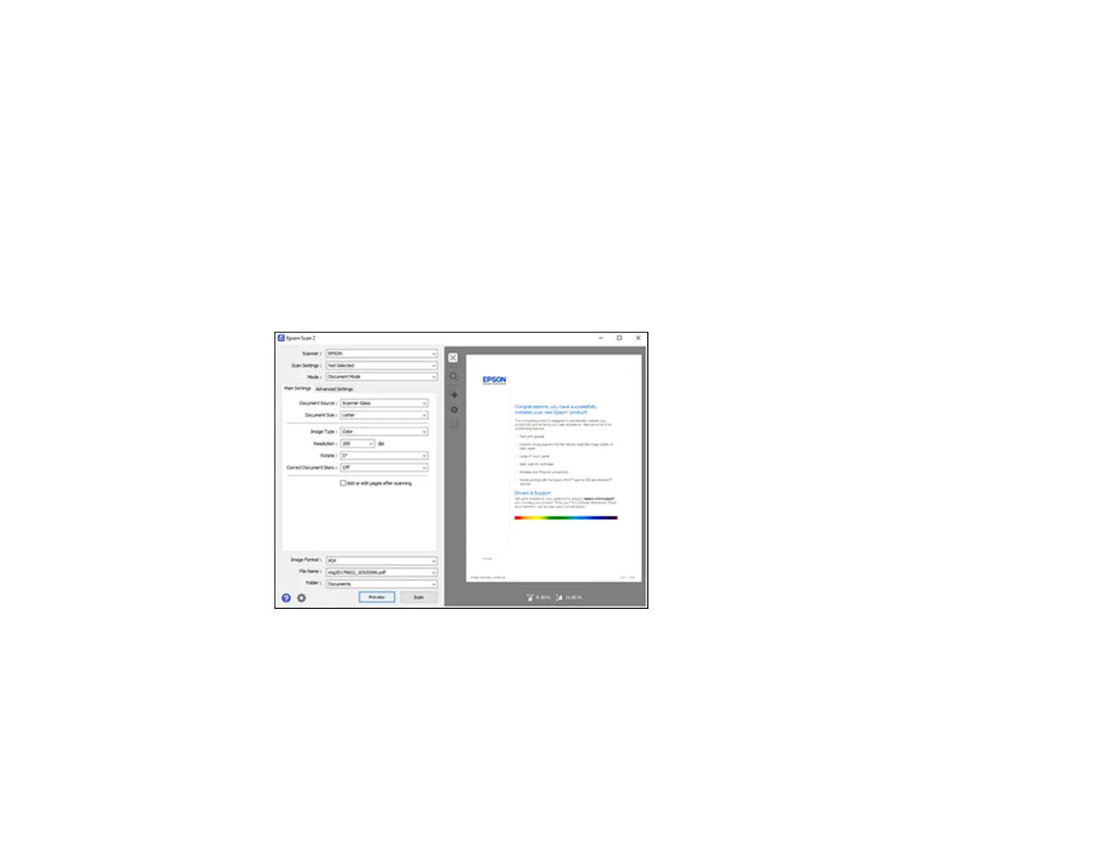 Epson Scan 2 previews your original and displays the results in the Epson Scan 2 window.