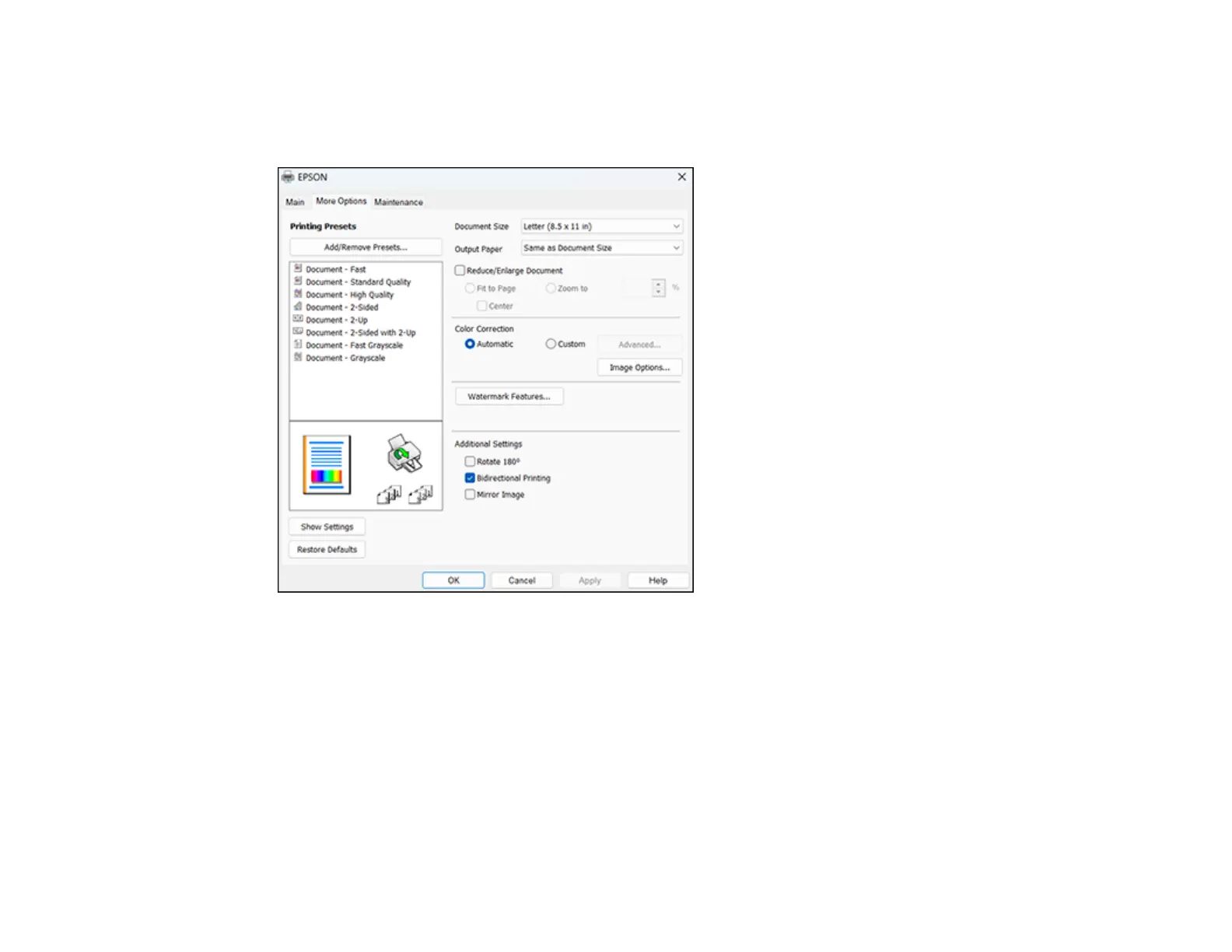 You can select a variety of additional layout and printing options for your document or photo on the More