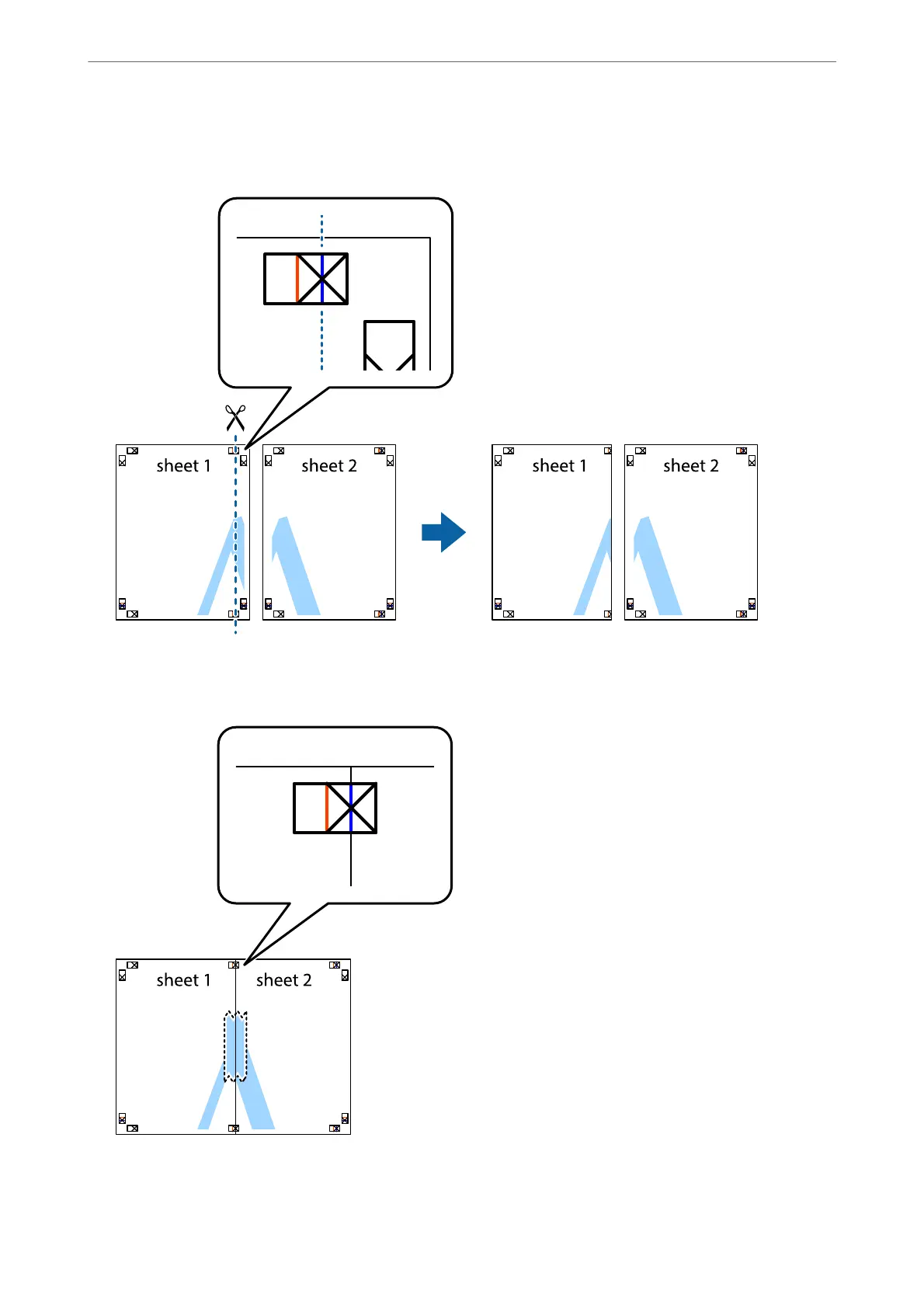1. Prepareer Sheet 1 en Sheet 2. Knip de marges van Sheet 1 langs de verticale blauwe lijn door het midden van