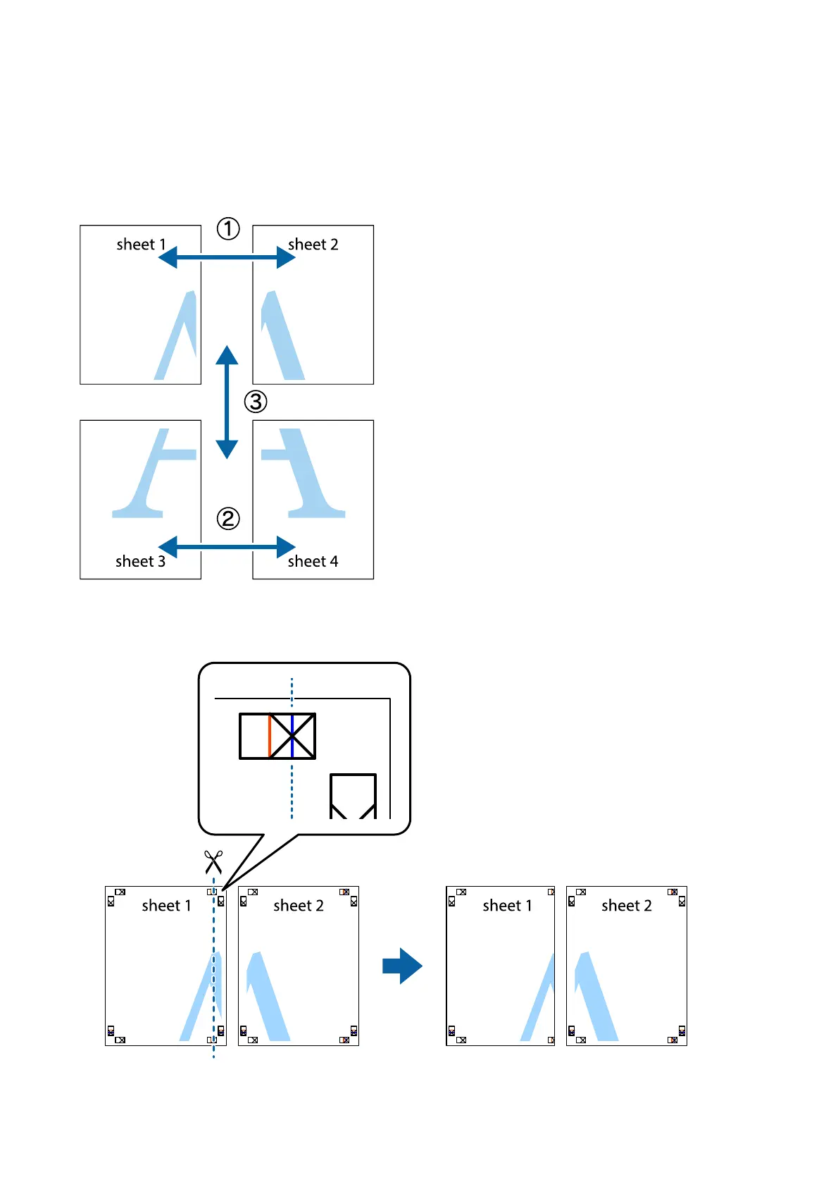 1. Prepare Sheet 1 and Sheet 2. Cut o the margins of Sheet 1 along the vertical blue line through the center of