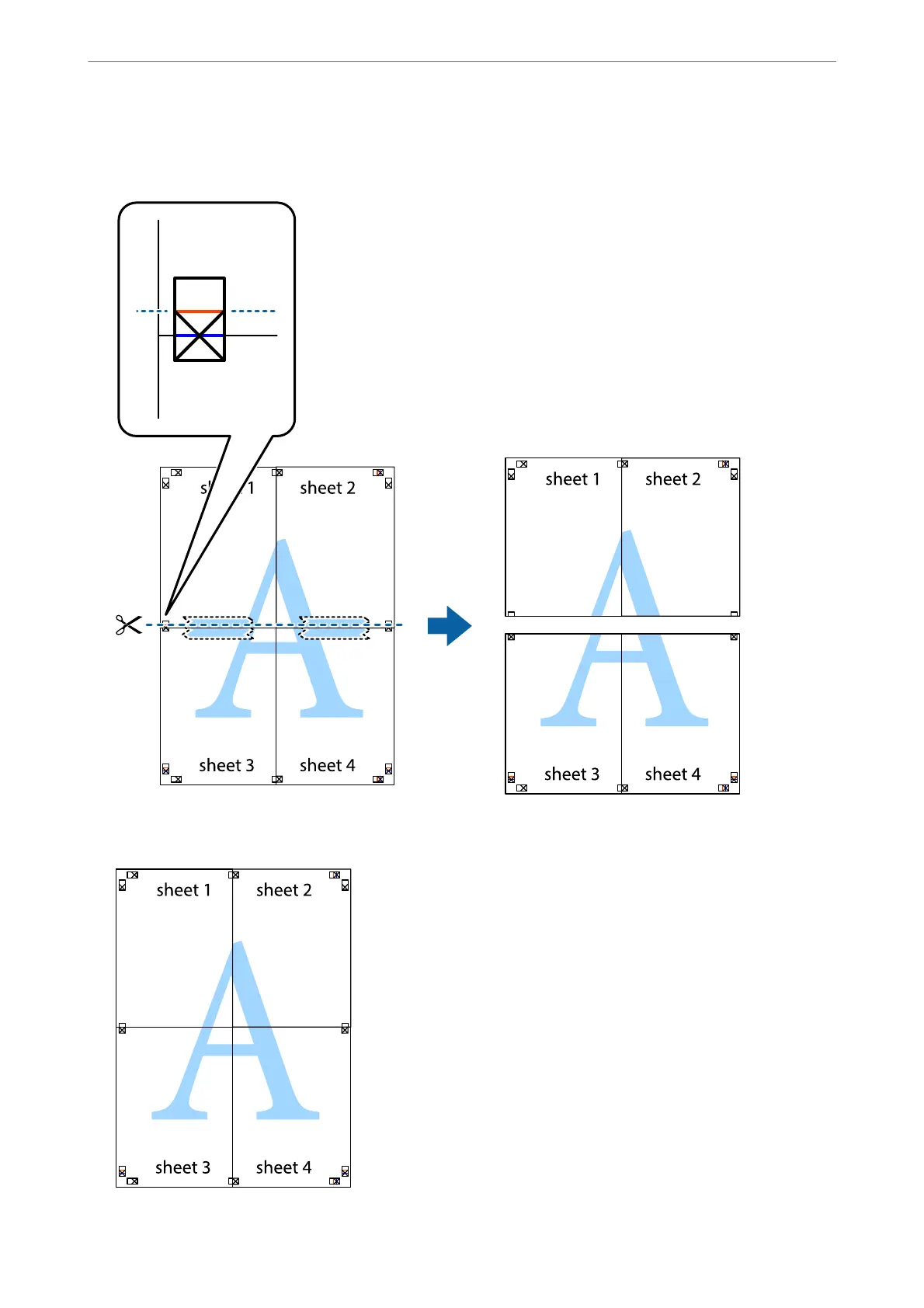 Cut the taped sheets in two along the horizontal red line through the alignment markers (this time, the line