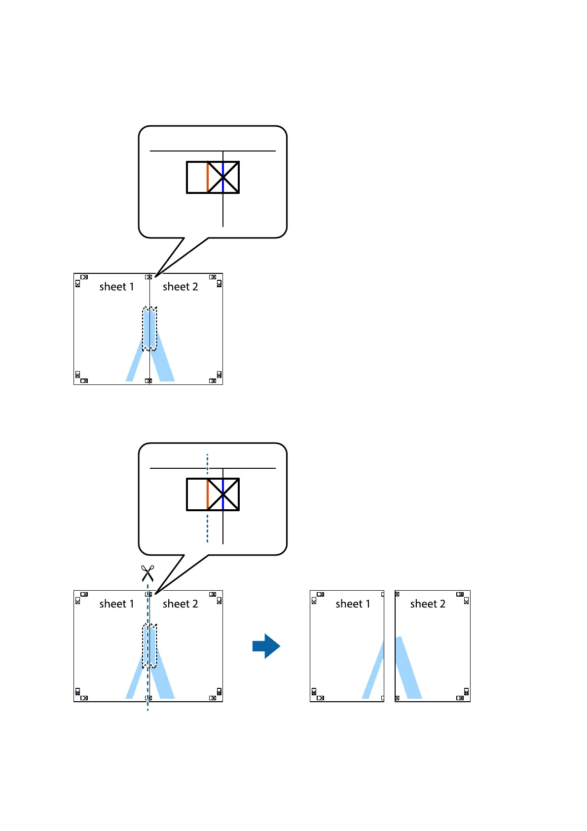 2. Place the edge of Sheet 1 on top of Sheet 2 and align the cross marks, then temporarily tape the two sheets