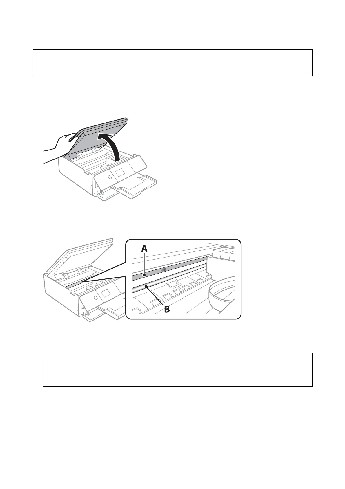 Be careful not to touch the rail (B). Otherwise, you may not be able to print. Do not wipe
