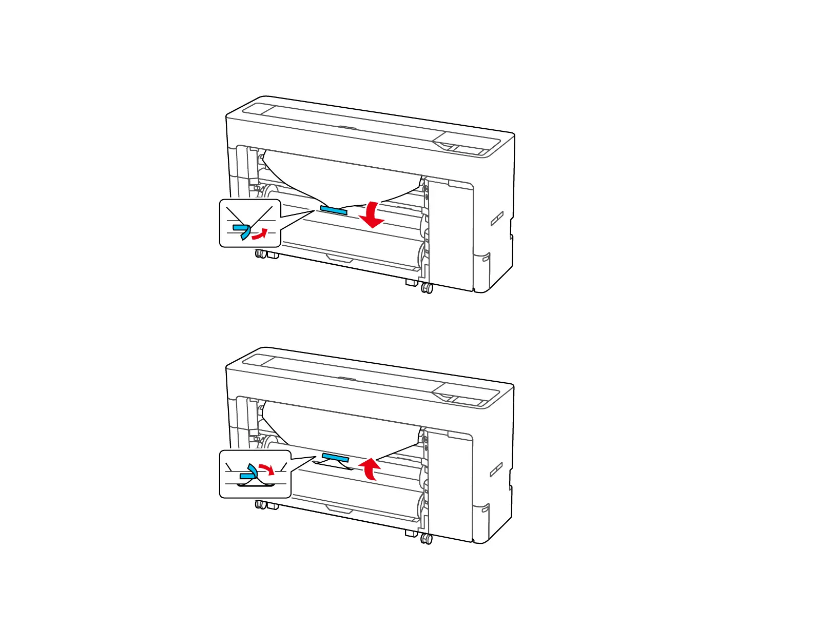 22. Confirm the take-up direction and tape the edge of the media to the center of the core as shown.