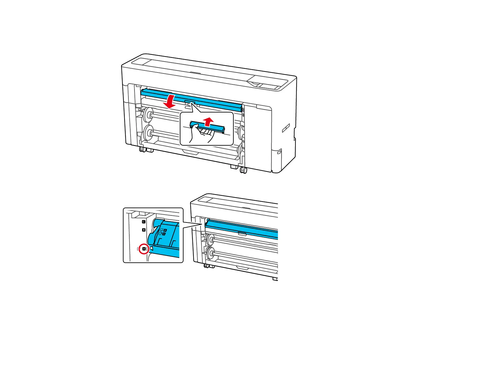 4. Lift up to release the paper output tray, then gently pull the tray open and place it into position A (the