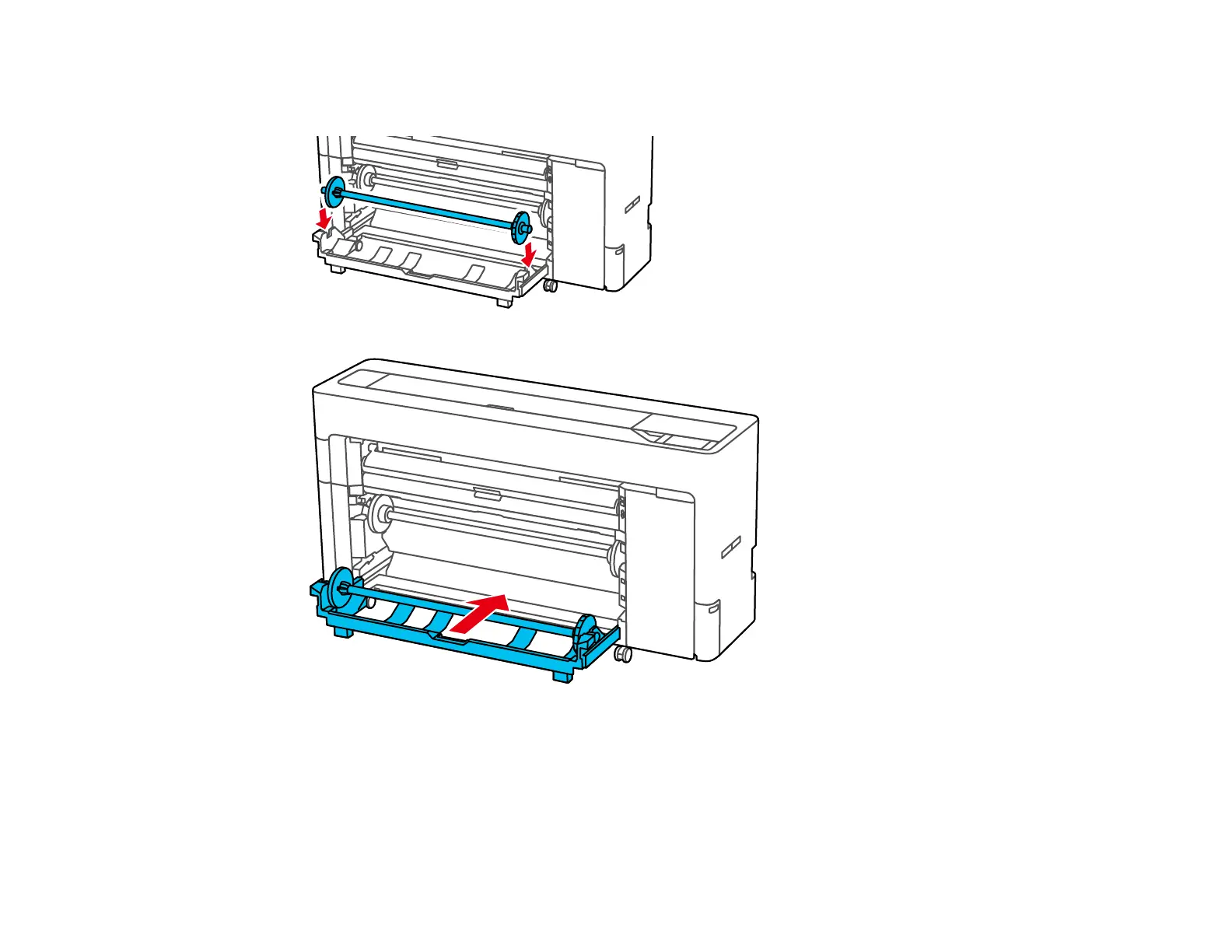 9. Place the spindle into the grooves on the Roll 2 unit with the black end of the spindle on the right,