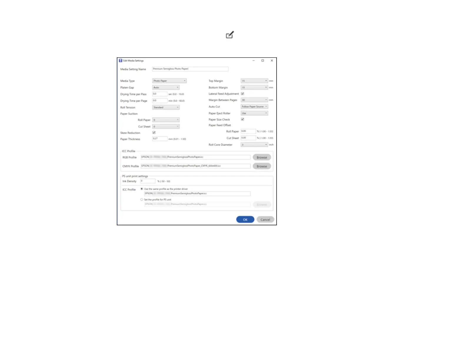 4. Select the new paper setting and click (edit).