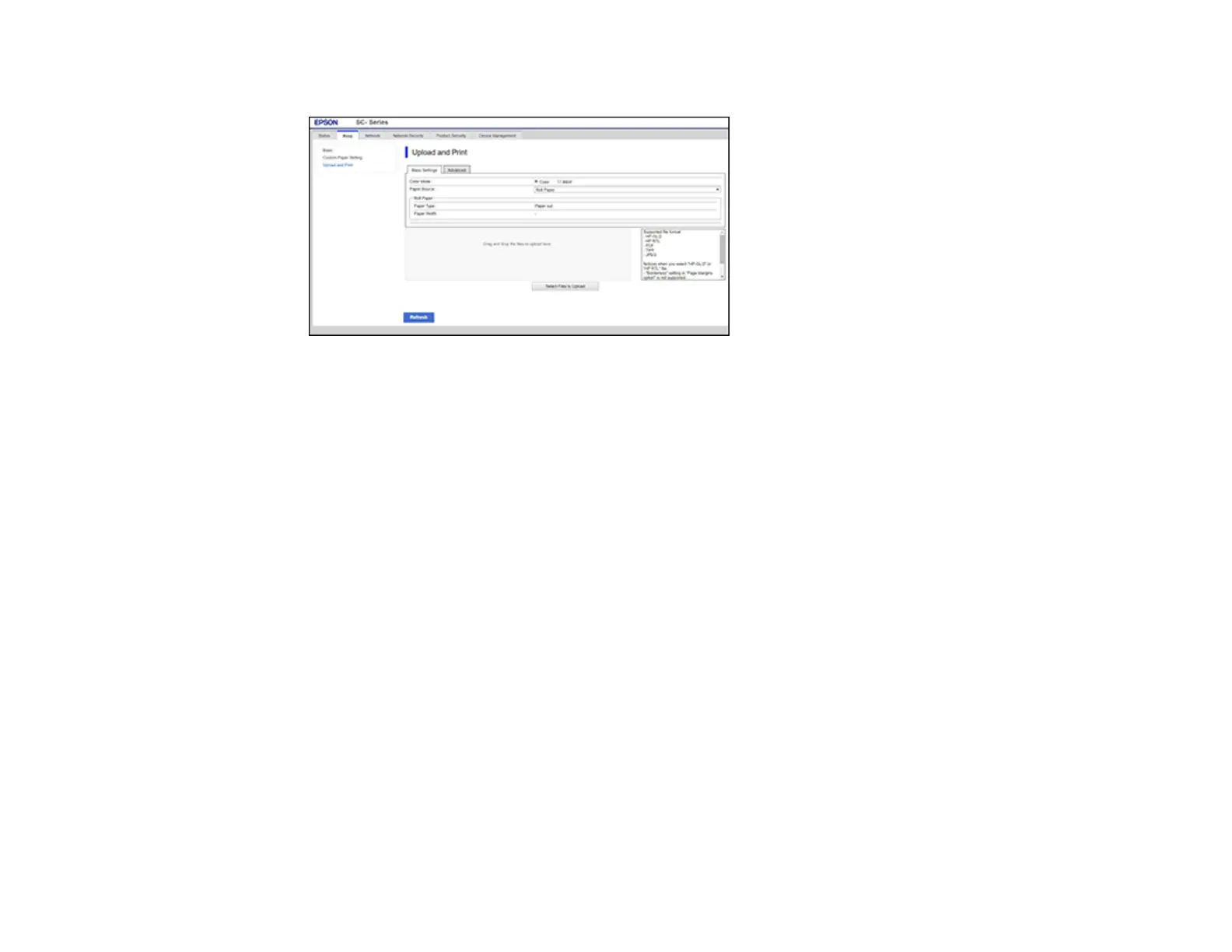 You can print the following file types from the Web Config interface: