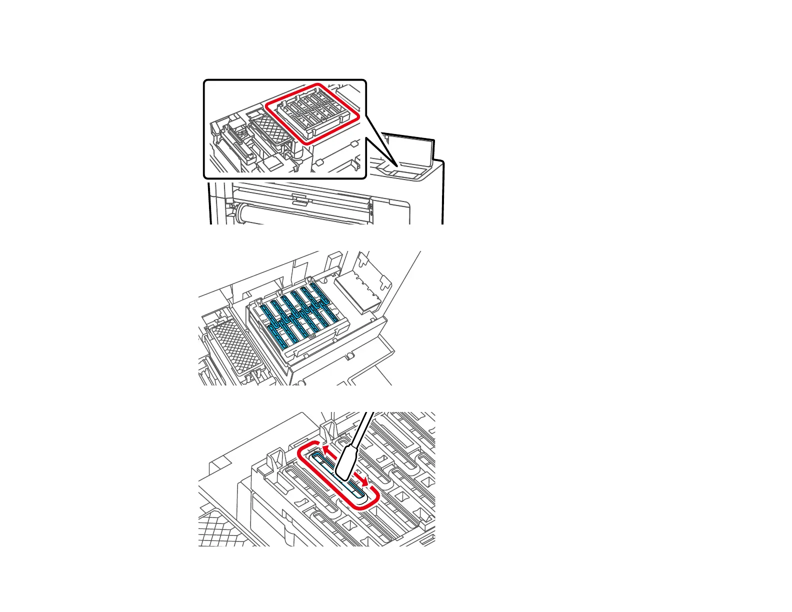 4. Use a new cleaning stick to clean the drying prevention caps area as shown.