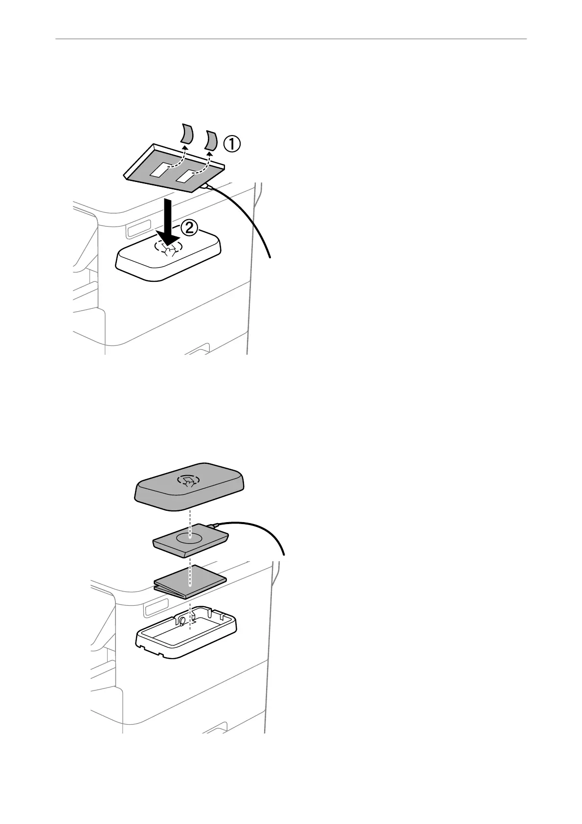 7. Bevestig het vericatieapparaatapparaat met de twee meegeleverde stukken dubbelzijdige tape (f) aan de