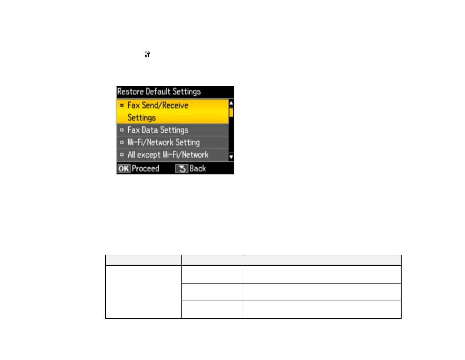 2. Press the arrow buttons to select Restore Default Settings and press the OK button.