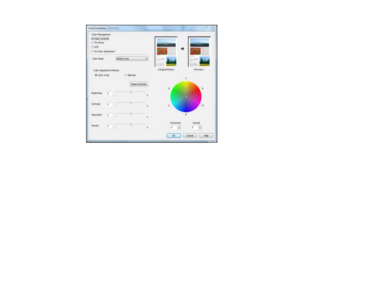 Lets you select a Color Mode setting, individual settings for Brightness, Contrast, Saturation, and