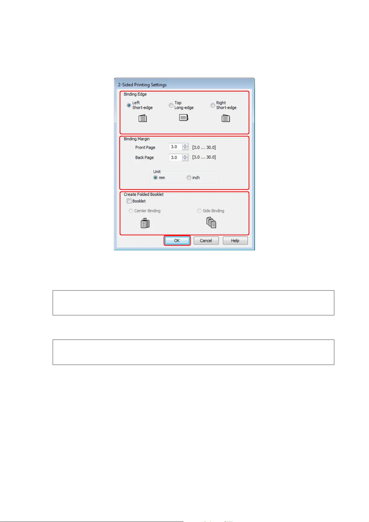selectievakje Booklet (Boekje) en kiest u Center Binding (In midden binden) of Side Binding (Aan zijkant