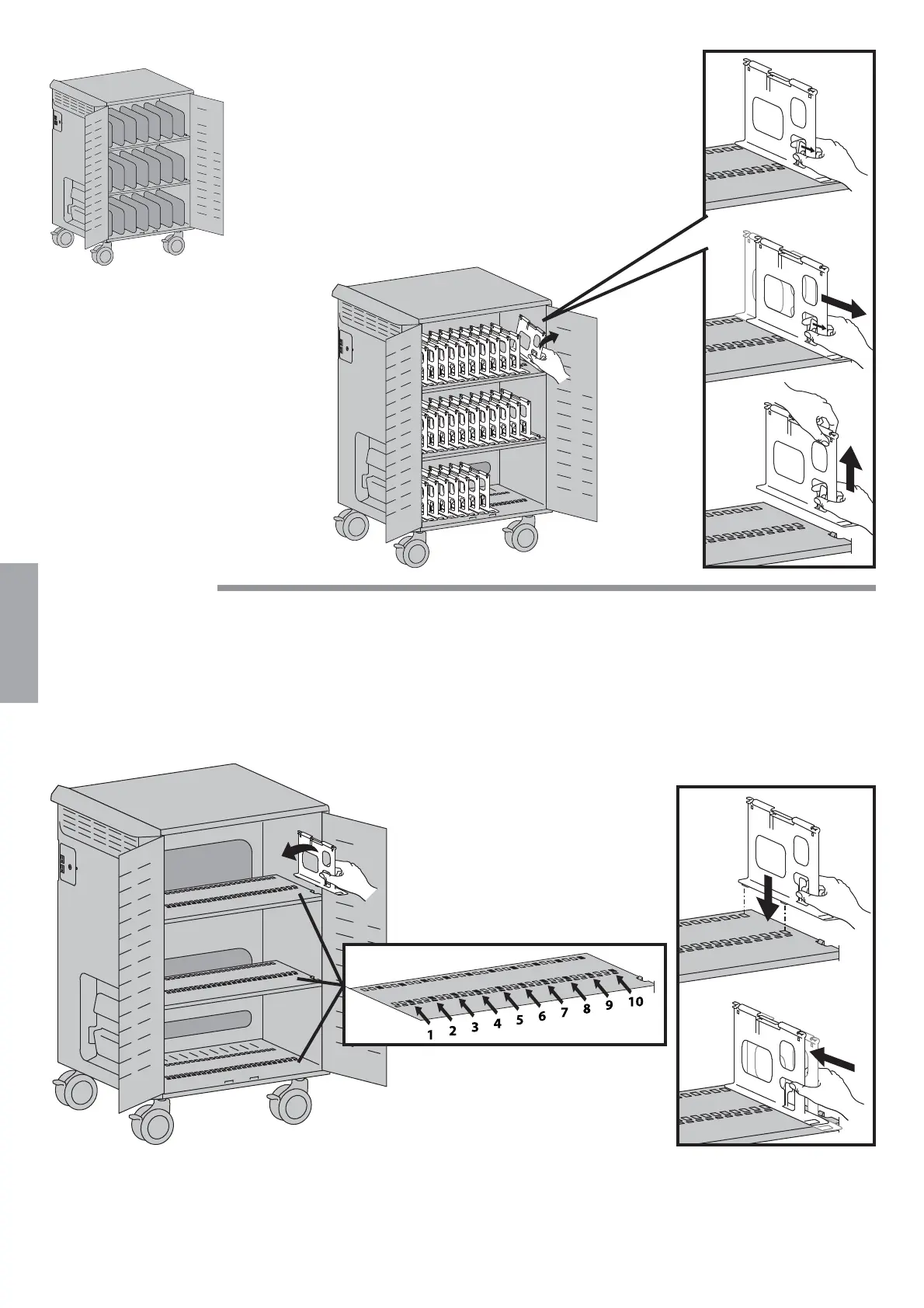 To confi gure for 30 devices, reattach dividers, 10 per shelf.
