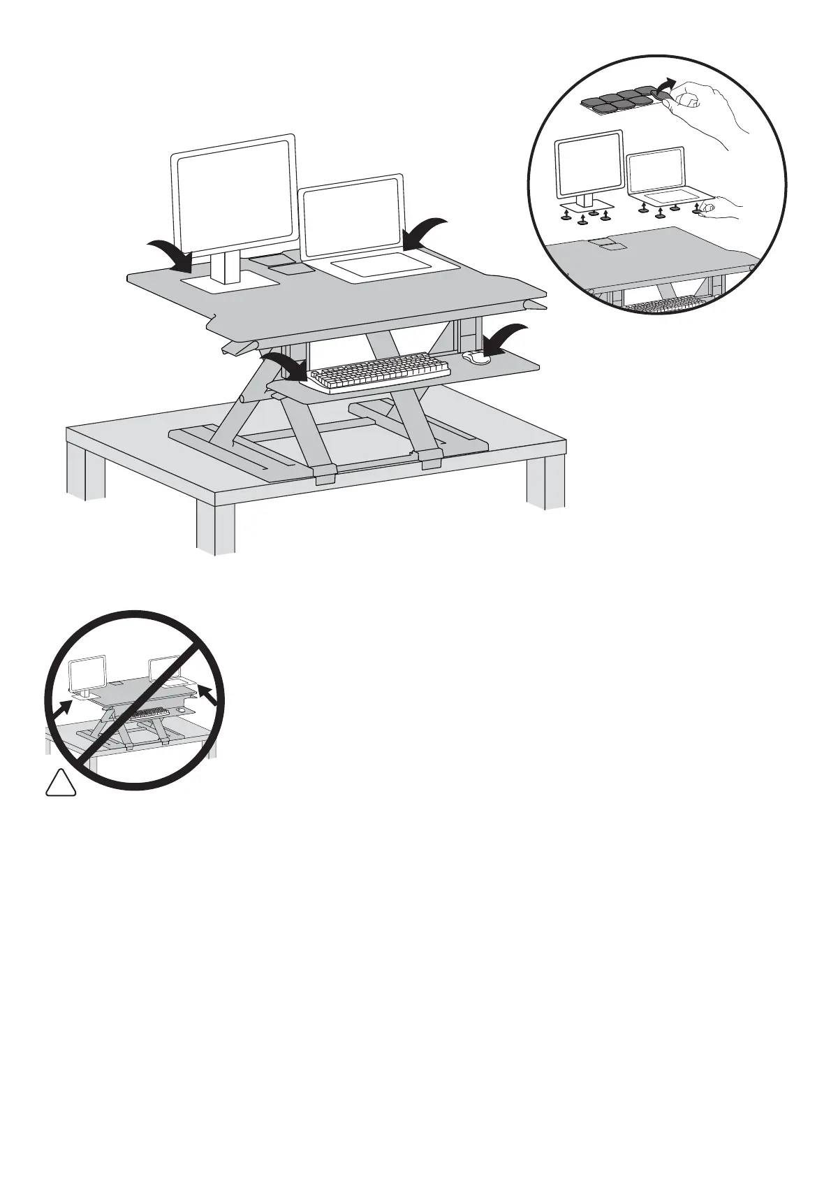 Caution: Keep monitor and laptop base fully on the worksurface. Allowing any part of base or stand to hang off the edge