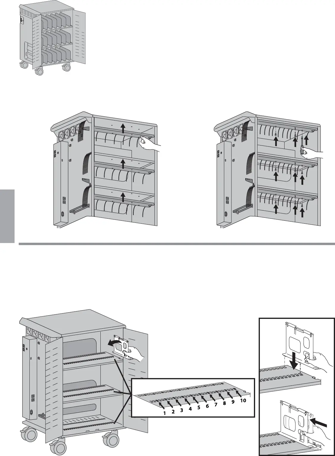 To con gure for 30 devices, reattach dividers, 10 per shelf.