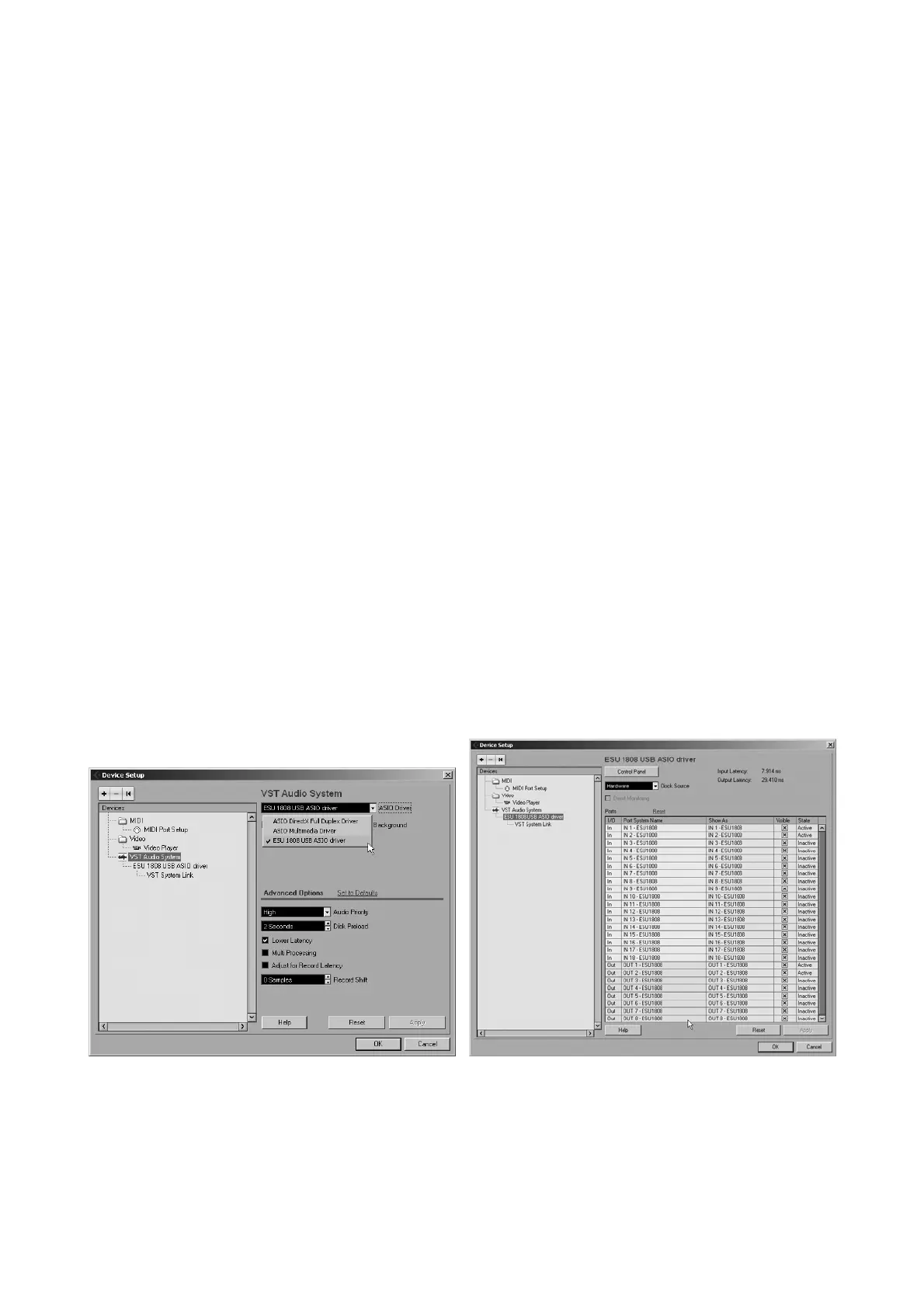 Make sure to select ESU 1808 USB ASIO driver as ASIO Driver entry. You can verify your