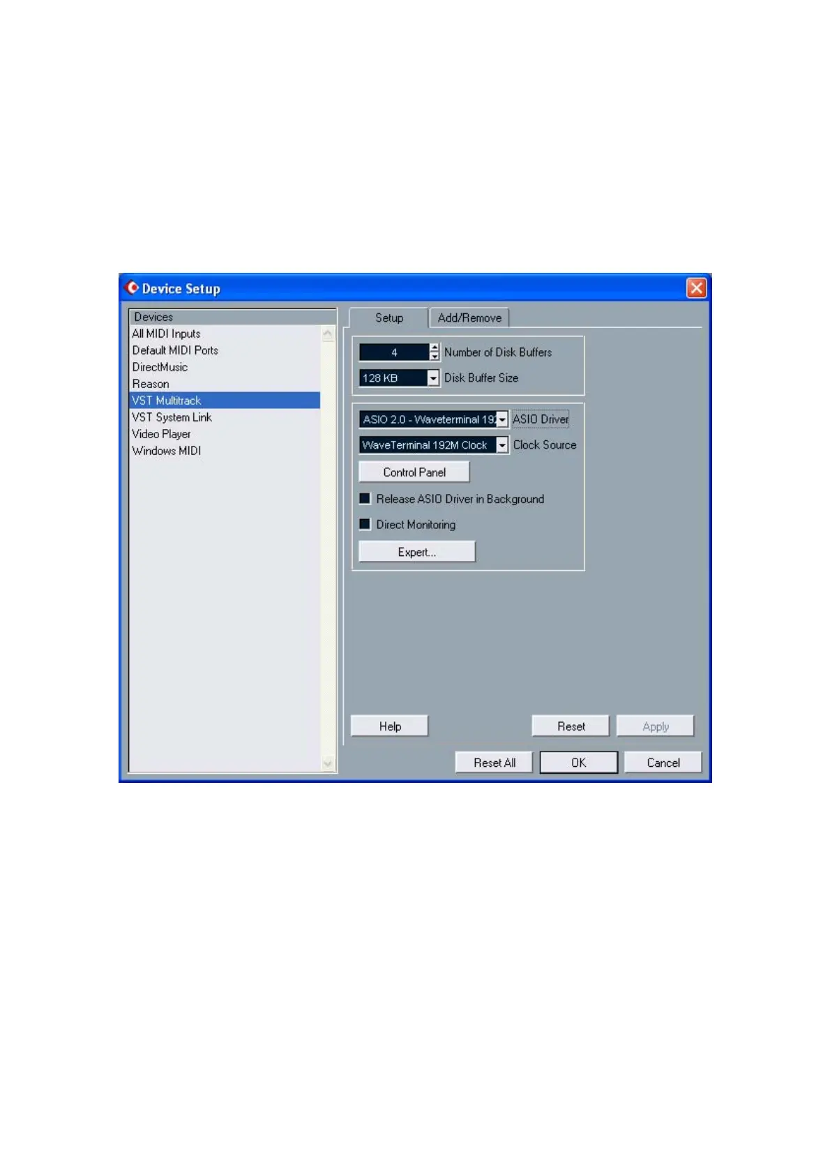 After launching Nuendo or Cubase SX, go to Device -> Device setup ->VST Multitrack.