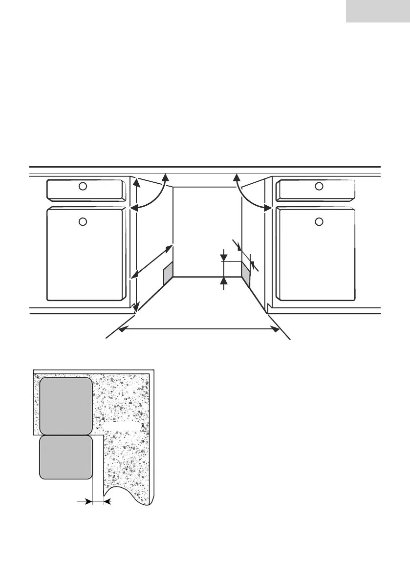 2. Pokiaľ bude umývačka inštalovaná v rohu skrinky, je potrebné ponechať určitý priestor
