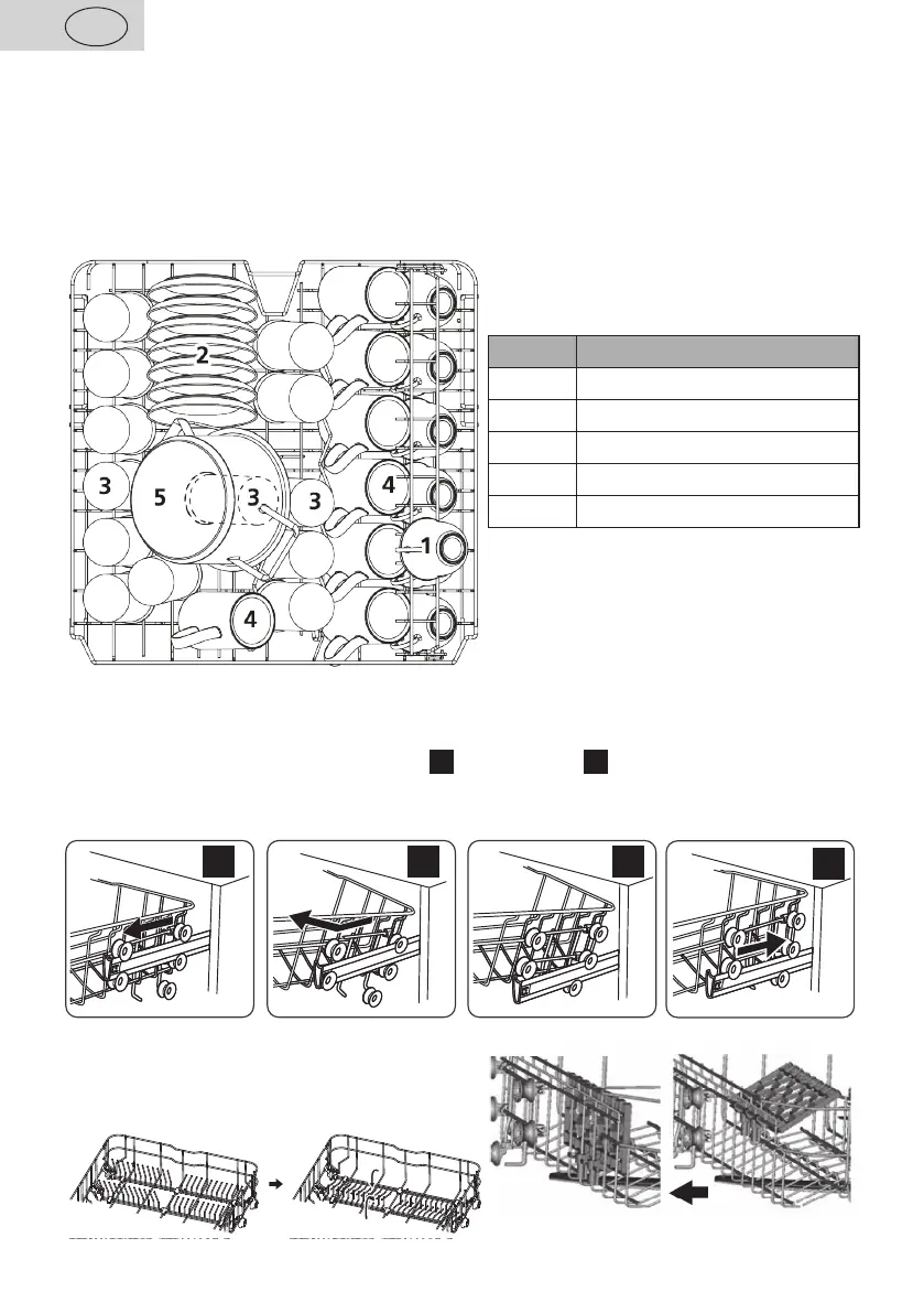 veľký riad v hornom alebo dolnom koši. Výšku horného koša možno upraviť tak, že do