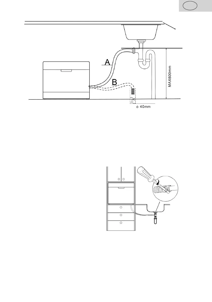 • Pripojte hadicu pre vypustenie vody. Vypúšťacia hadice musí byť správne pripevnená, aby