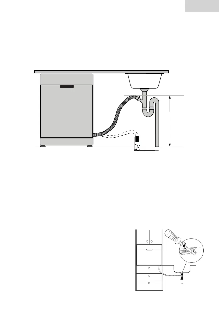 Pokud je dřez 1000 mm nad podlahou, nelze přebytečnou vodu v hadicích vypustit přímo