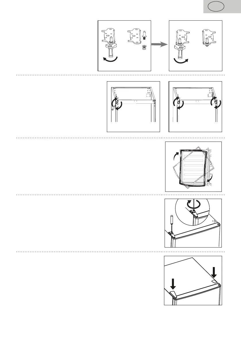 9. Postavte chladničku a nasaďte dvere na spodný záves.
