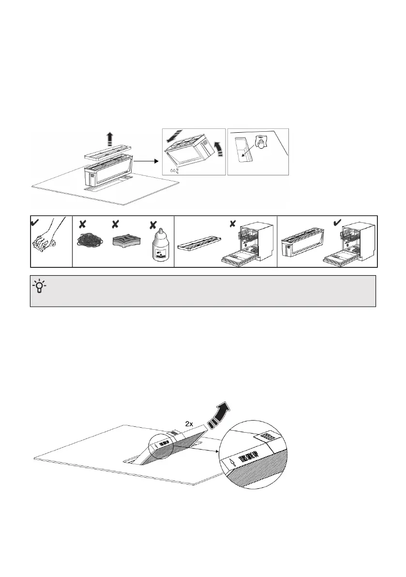 • Reinig de vetfilterunit en het inlaatgrid met warm water en afwasmiddel en een niet-schurende