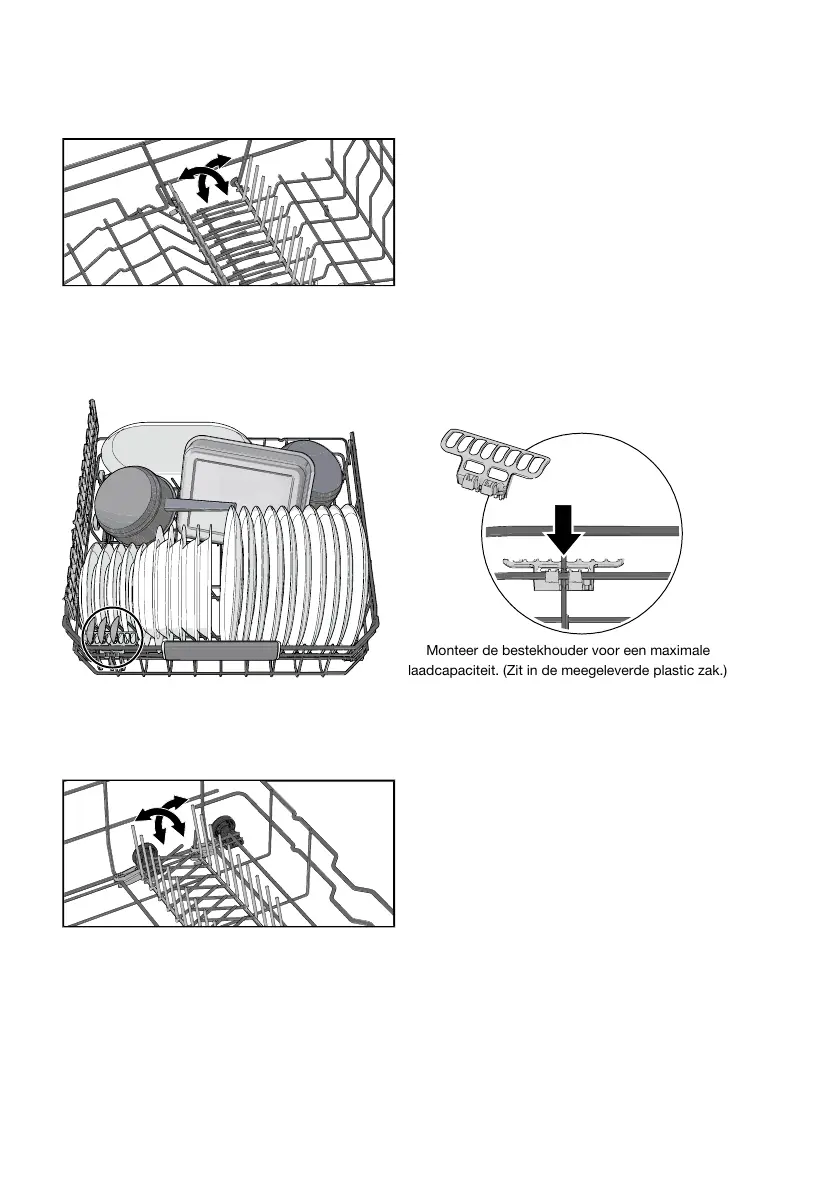 Plaats borden, dessertborden, serveerschalen en pannen in de onderkorf. Bestek kan in de
