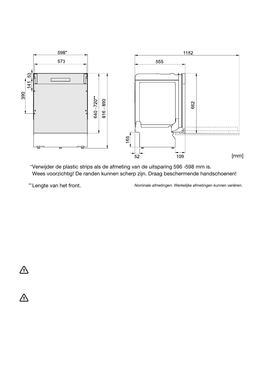 Verwijder de plastic strips als de afmeting van de uitsparing 596 -598 mm is.