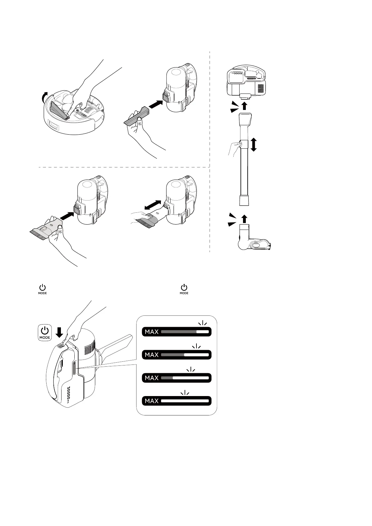 Press for 2 seconds to start or pause cleaning. Press to switch suction modes.