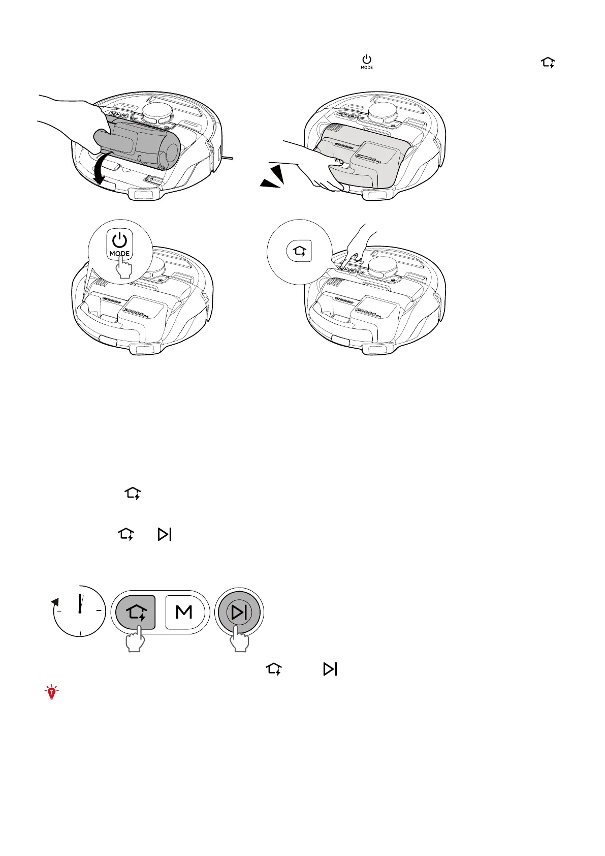 Insert the Cordless Stick Vacuum and push down until it clicks. Press to power on the robot. Then press to