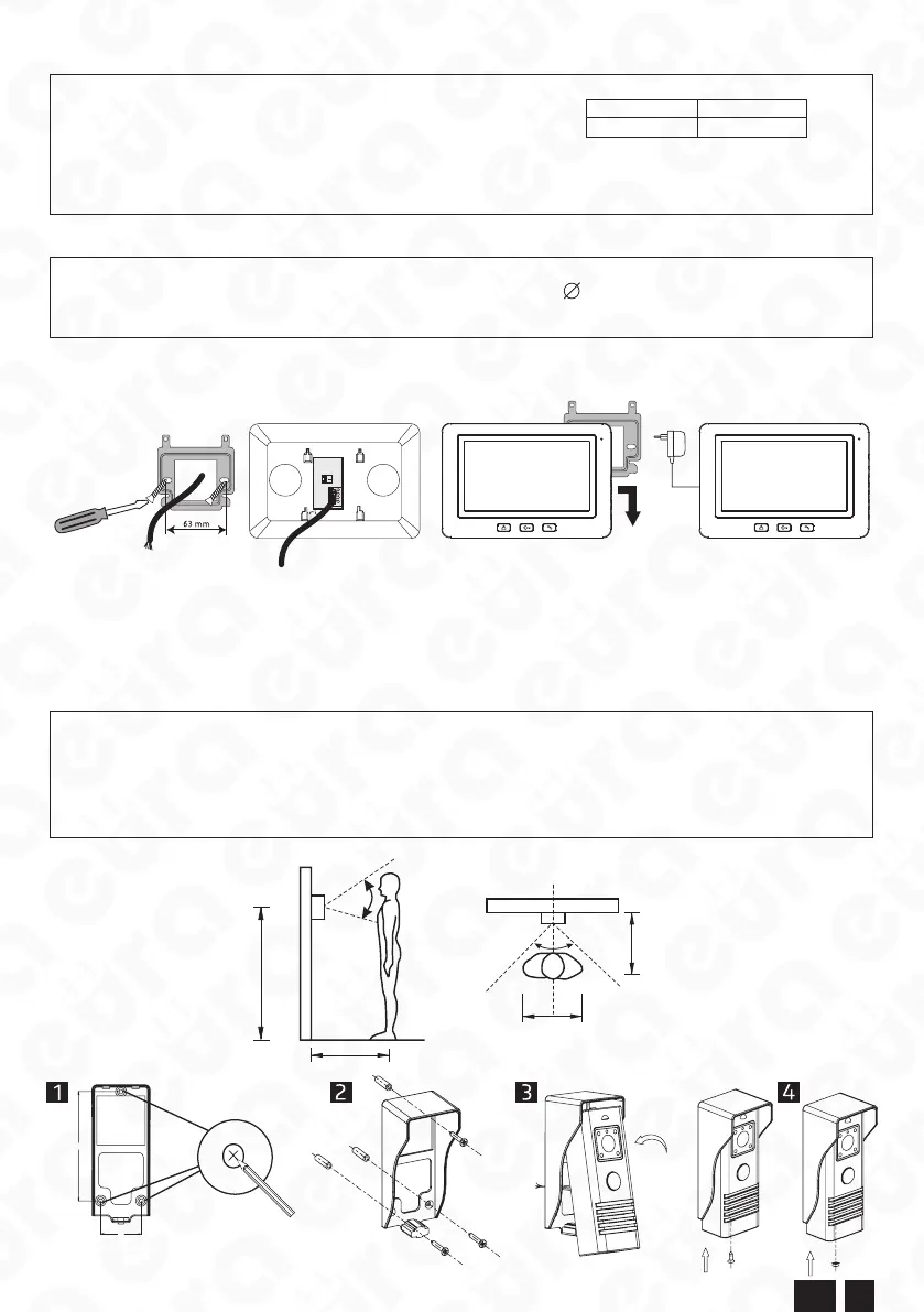 Zaleca sie przykręcenie ramki montażowej monitora do wcześniej osadzonej puszki podtynkowej 60 mm.