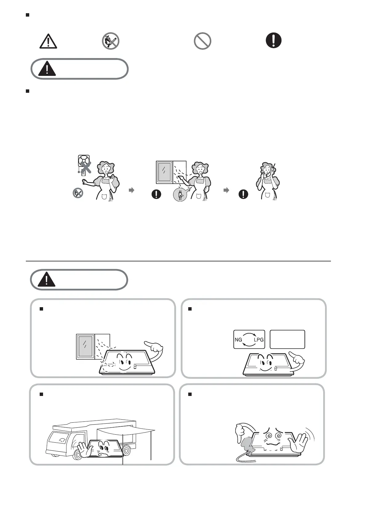 -- Do not switch ff any electrical appliance and do not touch any electric plug.