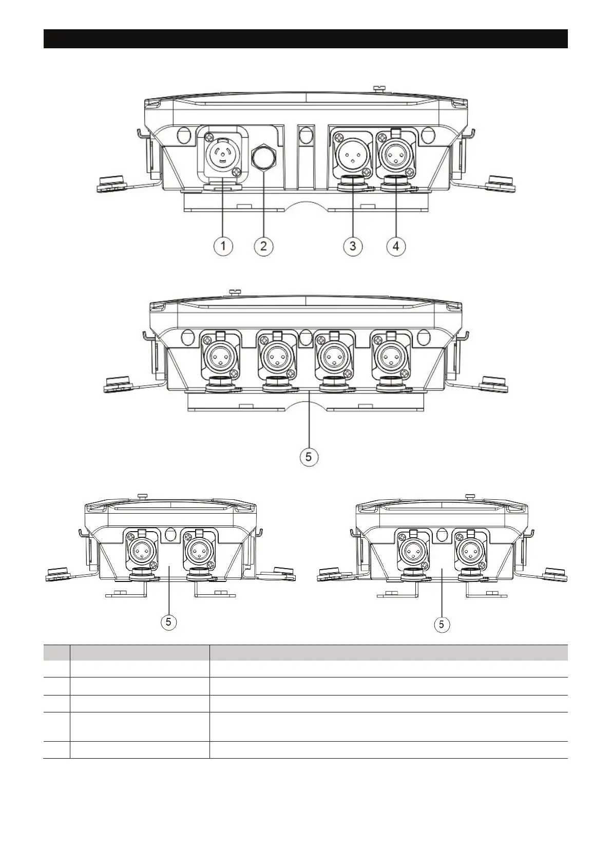 5 DMX512-Ausgänge (8) 3-polige IP-XLR-Buchsen zum Anschluss weiterer DMX-Ketten.